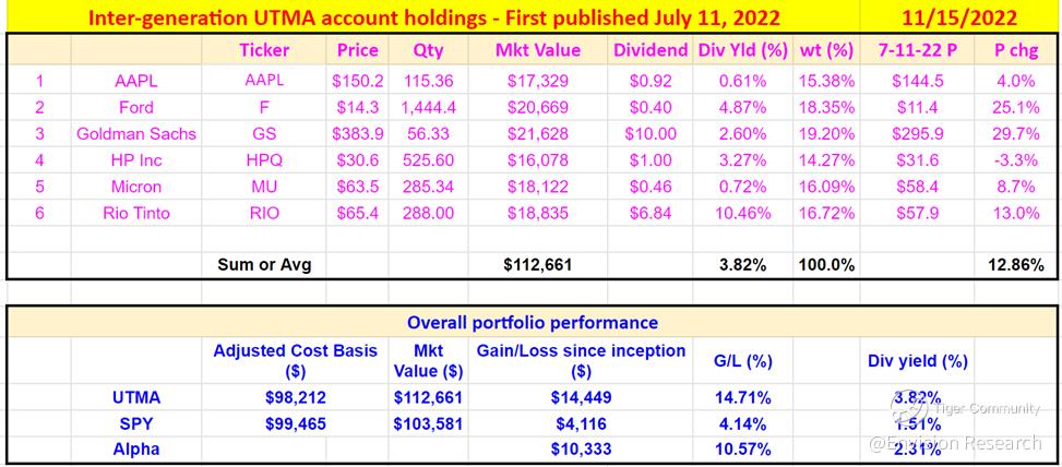 It is currently outperforming SPY by a large margin of 10.6% as of Nov 15 (we update the account monthly in the mid of each month). Note our picks yield much higher (3.82%) than SPY (about 1.51%), and the returns reported here were adjusted for dividend yields.