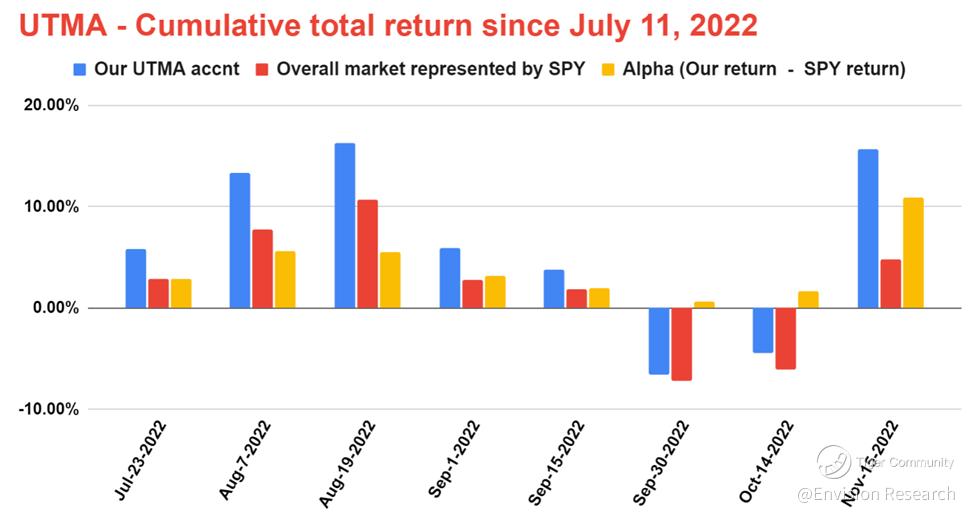For performance tracking, these charts used the prices on July 11, 2022 (the date I first published the UTMA account on Seeking Alpha). As can be seen, the UTMA account has consistently outperformed the SPY since then amid extreme market turbulence, despite (probably because of) the fact that it only holds a total of 6 stocks.
