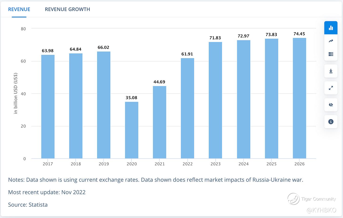 - Revenue is expected to show an annual growth rate (CAGR 2022-2026) of 4.72%, resulting in a projected market volume of US$74.45bn by 2026.