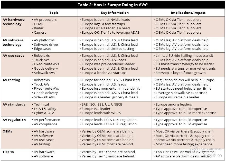 In thearticleby EE Times, Europe is implementing AV but lags behind China and USA in areas such as AV software, AV use cases & AV testing but leads in AV standards & regulations. In fact, the table below shows us how China, the USA and Europe are progressing in AV adoption.