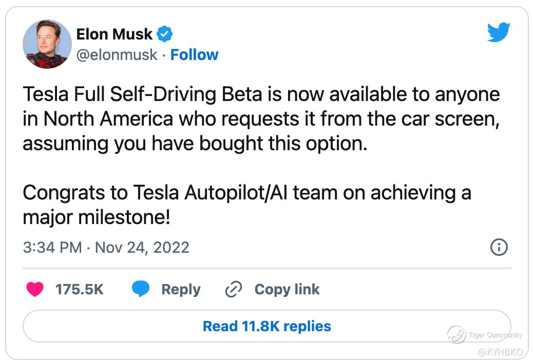 Elon’s tweet on FSD Beta for North America on 24 Nov 2022