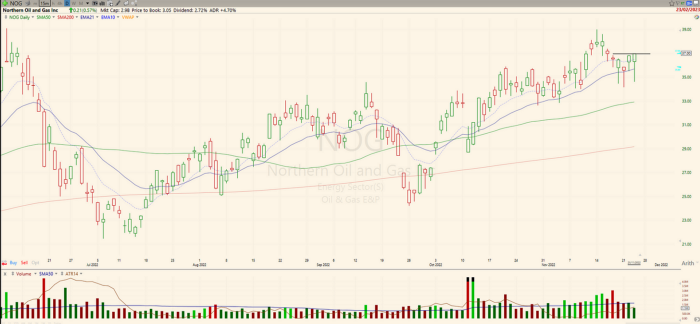 Northern Oil and GasNOG -2.40%↓acts constructively above the EMA21 and all the last 4 candles show buyers coming in at EMA21. A price above the black line might work. Stop Loss: EMA21.