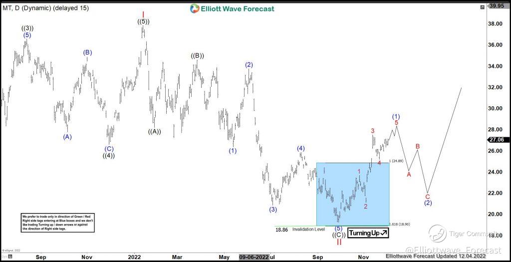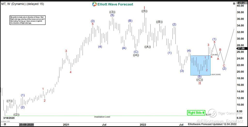 MT made a low of $6.64 in March-2020 against 2008 high. While above there, it startedimpulseup, which ended at $37.87 high finished as wave I. Below there, it proposed ended wave II at $19.25 low at blue box area. While above there, it started reacting higher. It expect to resume higher in wave III, which confirms above $37.87 high or at least can see larger 3 swing bounce in double correction in II.