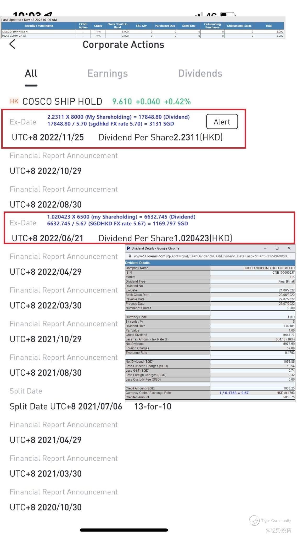 Cosco ship holding has reward me with handsome dividends payout this year collected 4K in sgd, better than dbs bank with dividend yield of approx 5%, collecting 1320 SGD in dividend.