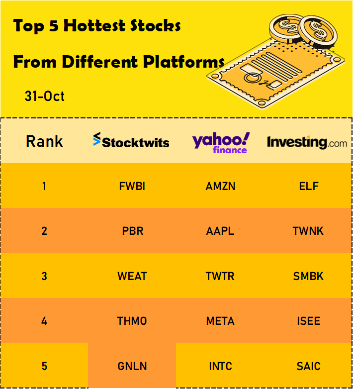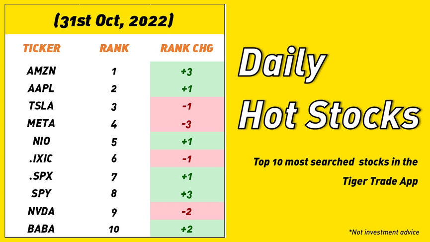 The Top5 trending tickers on Yahoo Finance: $Amazon.com(AMZN)$ $Apple(AAPL)$ $Twitter(TWTR)$ $Meta Platforms, Inc.(META)$ $Intel(INTC)$