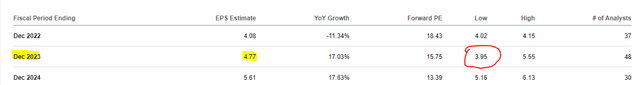 Growth is gone. Non-GAAP earnings estimates are now for $4.08 in 2022 vs $4.60 in 2021. The crowd is expecting $4.77 for 2023 and we think that circled analyst at the low-end is likely to be correct.