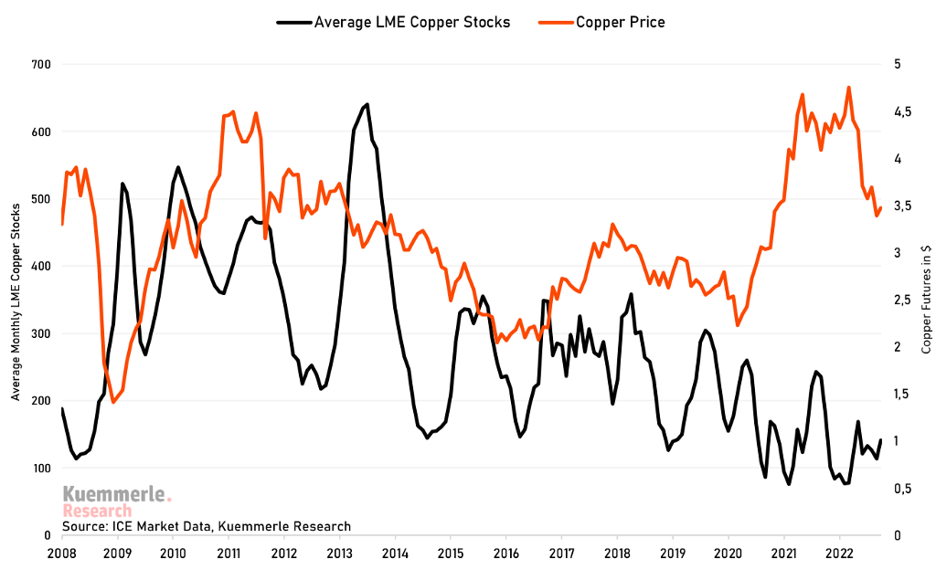 I think the critical aspect for investors here is that even while visible copper inventories are extremely low, the slowing economic growth component is providing a solid drag on copper prices at the moment and probably also going forward until we see signs of improving economic momentum again. Also important to know, the correlation between copper inventories and the futures price is not good and, therefore, not a good correlation indicator to use! More data points are needed to judge a commodity’s price than “just” the inventory data.